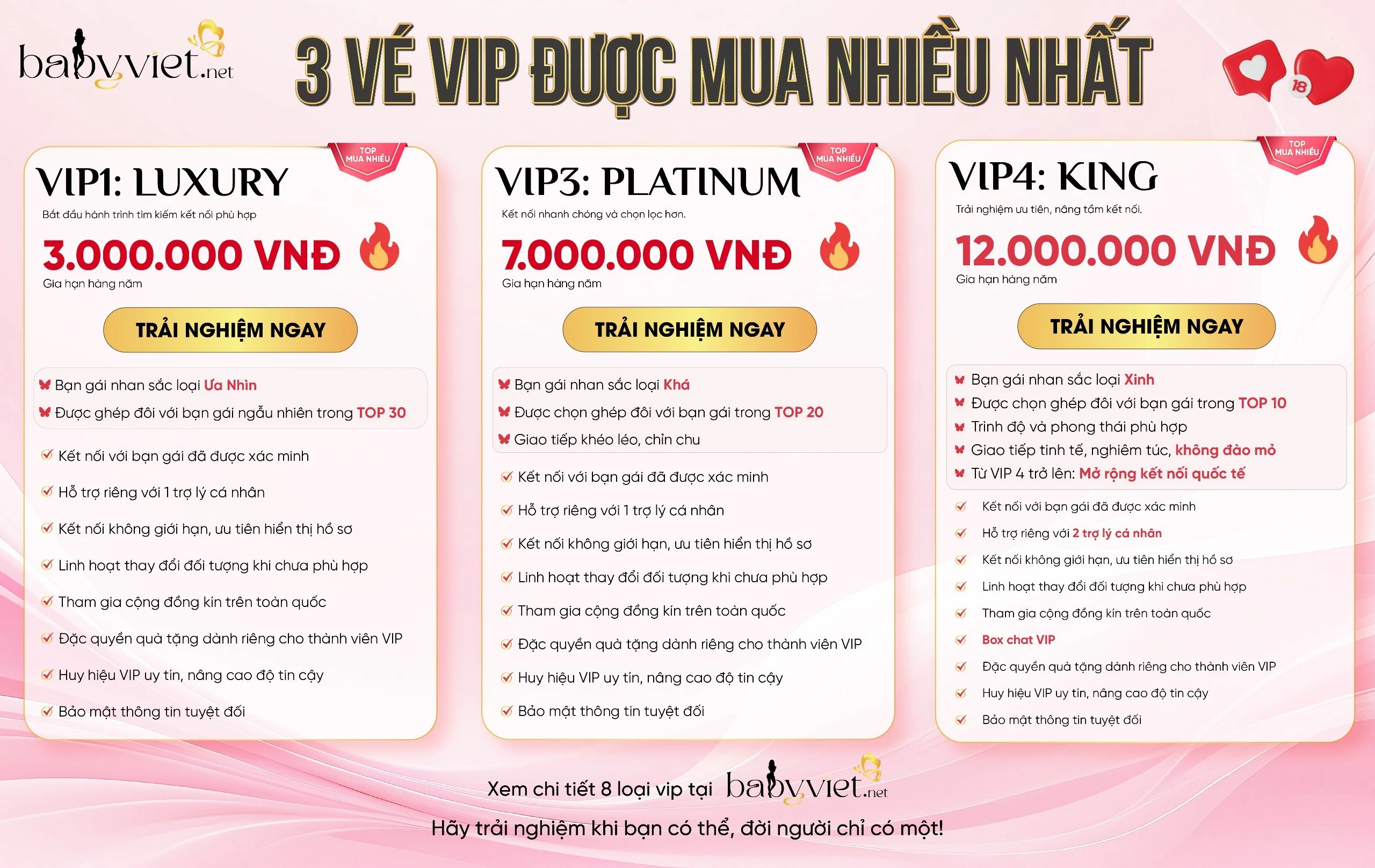 - LỢI ÍCH: Được tham gia TOP BẠN TRAI VIP của Việt Nam – Hưởng trọn vẹn các đặc quyền ưu tú nhất, kết nối với những BẠN GÁI xinh nhất